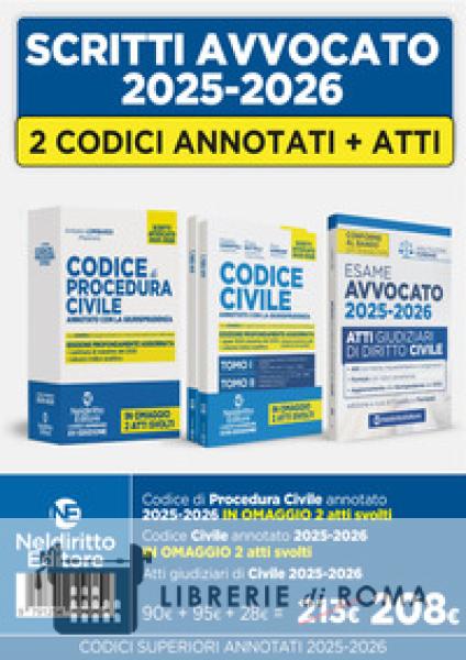 Anche nella sessione 2025-2026 è prevista, per l'esame di Stato per l'abilitazione alla professione di avvocato, la prova scritta, consistente nella redazione di un atto giudiziario. La prova orale, invece, sarà articolata in più fasi di cui la prima consiste nella soluzione di un caso. Sono destinati a essere nuovamente decisivi, pertanto, i Codici annotati, in specie quelli che garantiscono, completezza, aggiornamento, rapidità nella consultazione e nella ricerca delle massime pertinenti. I Codici Superiori annotati con giurisprudenza, Neldiritto Editore 2025 - da circa 20 anni diffusamente utilizzati da professionisti e aspiranti avvocati - sono il risultato dell'impegno profuso da giuristi autorevoli. Nelle Edizioni 2025-2026, i Codici, oltre che aggiornatissimi, sono profondamente ripensati, riorganizzati, arricchiti. Particolare impegno, anche in questa Edizione 2025-2026, è stato profuso nell'assicurare: l'aggiornamento dell'apparato normativo, la completezza e ricchezza delle questioni giurisprudenziali segnalate, la chiarezza delle massime riportate; la logicità dei sommari sotto le singole disposizioni, organizzati in modo da consentire l'agevole individuazione dei profili esaminati e l'intuitiva ricostruzione dei percorsi logici sottesi; la struttura grafica che favorisce un'agevole consultazione, anche grazie ad un uso sapiente della tecnica del grassetto; la particolare visibilità delle decisioni più recenti e di quelle degli organi nomofilattici; il puntuale aggiornamento alla giurisprudenza più recente, anche di merito. In questa Edizione sono state inserite numerosissime massime riferite alla giurisprudenza, anche europea, del 2025. È stato, infine, arricchito l'indice analitico. Tanto per il professionista quanto per chi deve sostenere le prove dell'esame di abilitazione forense è fondamentale poter individuare tempestivamente le massime che affrontano gli aspetti di diritto decisivi per la soluzione del caso. In questa prospettiva, l'indice è composto da migliaia di voci di cui numerose (distintamente evidenziate) che rinviano alle norme per le quali è intervenuta la giurisprudenza del 2025 e degli anni precedenti.