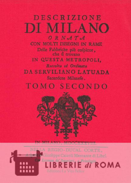 E' il secondo tomo della Descrizione di Milano del sacerdote milanese Serviliano Latuada pubblicata nella regio-ducal corte a spese di Giuseppe Cairoli, mercante di libri, tra il 1737 e il 1738, in cinque tomi con 42 tavole fuori testo ripiegate, disegnate da Ferroni e incise da Schiller.