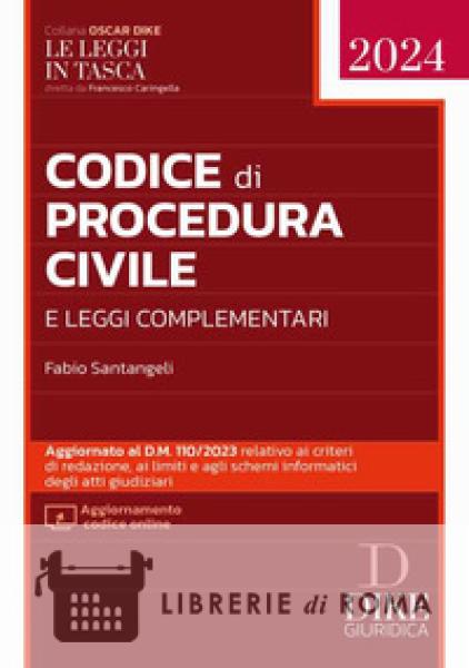 Il codice è aggiornato alla L. 9 ottobre 2023, n. 137, conv. D.L. 105/2023, in materia di procedimenti civili davanti al tribunale per i minorenni e al D.L. 5 ottobre 2023, n. 133, in materia di espulsione per gravi motivi di pubblica sicurezza dei cittadini stranieri in possesso del permesso di soggiorno UE. È corredato dalle principali leggi complementari in tema di Adozione, Avvocati e Procuratori, Cambiale e Assegno, Consumatori, Crisi d'impresa e insolvenza, Competenza giurisdizionale, Controversie di modesta entità, Criteri di redazione, limiti e schemi informatici degli atti giudiziari, Diritto internazionale privato, Disciplina dell'Unione Europea, Divorzio, Equa riparazione, Esecuzione, Giudice di pace, Legge abolitrice del contenzioso amministrativo, Locazioni, Matrimonio e responsabilità genitoriale, Mediazione e conciliazione, Negoziazione assistita, Notificazioni, Ordinamento giudiziario, Patrocinio, Procedimento europeo di ingiunzione di pagamento, Prove in materia civile e commerciale, Spese di giustizia e indennità, Processo telematico, Responsabilità dei magistrati, Semplificazione dei riti civili, Termini processuali, Titolo esecutivo europeo, Ufficio del processo.