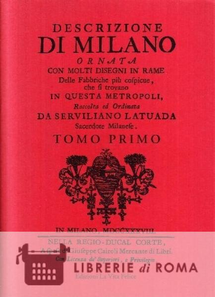 E' il primo tomo della Descrizione di Milano del sacerdote milanese Serviliano Latuada pubblicata nella regio-ducal corte a spese di Giuseppe Cairoli, mercante di libri, tra il 1737 e il 1738, in cinque tomi con 42 tavole fuori testo ripiegate, disegnate da Ferroni e incise da Schiller.