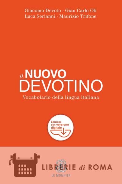 Pensato per avere tutto l'italiano a portata di mano, il Nuovo Devotino è uno strumento indispensabile per usare sempre la parola e l'espressione giusta nel giusto contesto: perché esprimersi in modo chiaro e appropriato è importante. La nuova edizione fornisce 60.000 voci, 10.000 parole del lessico di base chiaramente segnalate, 500 neologismi, 15.500 locuzioni, 25.000 significati del lessico specialistico (informatica, biologia, medicina, ecc.), divisione in sillabe e pronuncia corretta di tutte le voci, coniugazione di tutti i verbi irregolari, femminile e plurale di nomi, aggettivi e pronomi, reggenze in tutti i verbi. La versione digitale, per Windows, Mac, Linux, scaricabile sul proprio computer e su altri tre, può essere utilizzata anche con la Lavagna Interattiva Multimediale e contiene il testo completo del vocabolario, l'audio con la pronuncia corretta di tutte le voci, comprese quelle straniere, la coniugazione completa di tutti i verbi, i femminili e i plurali di tutti i sostantivi, aggettivi e pronomi, 180.000 tra sinonimi e contrari relativi a 33.000 voci.