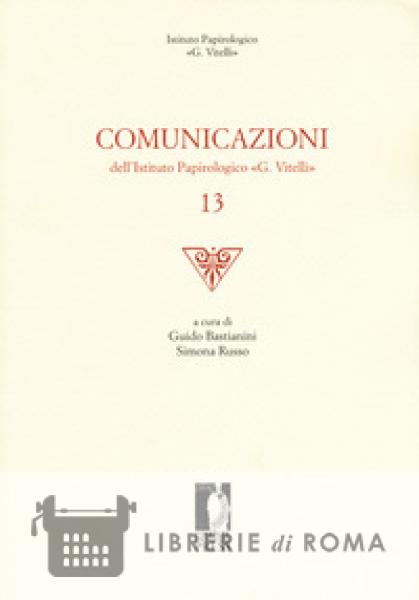 Il tredicesimo volume di "Comunicazioni" dell'Istituto papirologico «G. Vitelli» è articolato, come il precedente, in tre sezioni: Edizioni e riedizioni di testi; Note critiche; Chronique de lexicographie papyrologique de la vie matérielle. Nella prima sezione sono presenti testi, editi per la prima volta o oggetto di una revisione e di una nuova edizione, appartenenti a varie collezioni. Si presenta qui anche un eccezionale reperto di età araba, che fa parte della collezione dell'Istituto papirologico «G. Vitelli». La seconda sezione accoglie tre contributi con attente osservazioni paleografiche e linguistiche a testi letterari e documentari, e un quarto che offre un riassunto esaustivo sullo stato di pubblicazione di un archivio facente parte della collezione dell'Istituto. La terza sezione, infine, come ormai consolidato dal precedente volume delle "Comunicazioni", raccoglie numerosi frutti del progetto di ricerca internazionale sulla lessicografia della cultura materiale (Lex.Pap.Mat.) documentata nella lingua dei papiri.