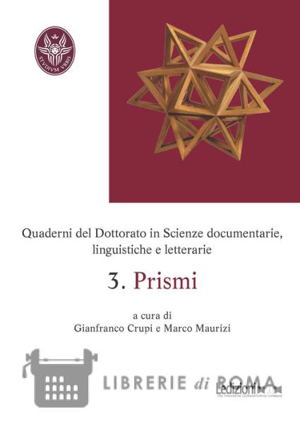 Lo scopo di questi Quaderni è in primo luogo quello di documentare e condividere l'esperienza didattica e scientifica del Dottorato di ricerca in Scienze documentarie, linguistiche e letterarie che ha sede presso l'Università La Sapienza di Roma. La prima sezione è dedicata ad aprire qualche "finestra" sull'attività didattica svolta nel Dottorato, in parte condivisa e in parte rivolta specificamente a singoli curricula, e sempre attenta sia alla dimensione della discussione, del dibattito, sia al respiro internazionale. Nella seconda sezione trova spazio invece una selezione di contributi, di dottorandi in corso e dottori che hanno conseguito il titolo negli ultimi due o tre anni, che illustrino nel loro complesso l'ampio orizzonte tematico delle ricerche portate avanti nel Dottorato. Alcuni dottorandi, inoltre, hanno collaborato alla redazione del volume, arricchendo anche in questo modo la loro esperienza. Inoltre si è ritenuto opportuno includere, come terza sezione, un repertorio delle ricerche e delle relative tesi di Dottorato, che prosegue e integra quelli già pubblicati nei primi volumi di Prismi.