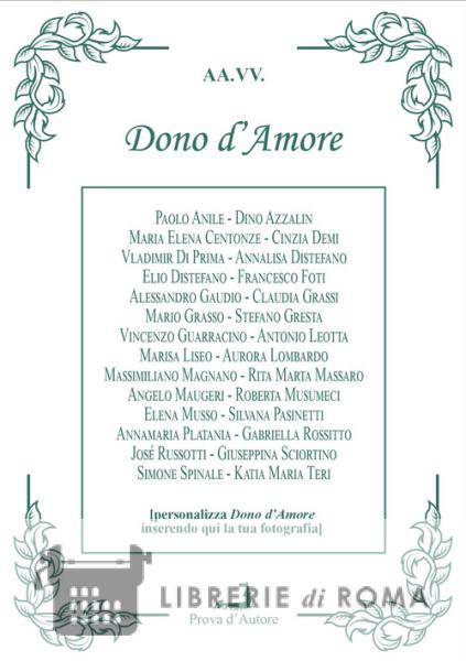 «"Dono d'Amore" è un'antologia di poesie che cantano l'Amore in tutte le sue mille declinazioni che segnano, tra l'estasi e il tormento, il senso profondo della vita e dell'esistere. Questa raccolta poetica è composta da 28 autori, che ne colgono l'essenza e le sfumature del corpo, della mente e dell'anima. La fonte, cui la curatrice, nonché editrice di Prova d'Autore e della rassegna Lunarionuovo , ha attinto queste composizioni poetiche, proviene dalle varie pubblicazioni della Casa editrice e della Rassegna suddetta, nonché da raccolte antologiche di diverso editore; molte liriche sono anche inedite. Quasi tutti gli Autori, più o meno giovani, le cui composizioni sono incluse in questa mini-antologia, fanno parte del virtuoso bagaglio di Prova d'Autore, il cui direttore editoriale è stato Mario Grasso, con pubblicazioni più o meno recenti e frutto delle iniziative che ha promosso nel corso dei diversi decenni e che la Casa editrice continua a promuovere. La realizzazione grafica di questo progetto consiste in accorgimenti tecnico-grafici, sia all'interno delle pagine, che contribuiscono ad esaltare l'edizione di questo Dono d'Amore, nonché della sua copertina adatta a trasformarsi in portafotografie, mentre la pagina interna, successiva al frontespizio, è bianca per accogliere la dedica personalizzata di quanti vorranno destinare questo libro-gloxinia a petit-cadeau per la persona amata. O, per occasioni diverse, come è successo per l'edizione del 2007 di Dedica d'Amore , uscita il 14 febbraio dello stesso anno e che in seguito è diventata bomboniera di nozze o di anniversari. "Dono d'Amore" ci invita a riflettere sul potere trasformativo dell'Amore, sia nella sua forma tragica che in quella sublime; questo tema universale , esplorato da Ovidio, Dante, Petrarca e Goethe, ha attraversato i secoli e lasciato opere che hanno segnato la storia della cultura e immortalato, attraverso la magia delle parole, momenti della nostra vita. Solo attraverso la forza dell'Amore, materia e spirito trovano la completezza per ricongiungersi alla Fonte dover risiede la risposta alle mille domande che affollano la mente umana, e che solo i poeti hanno la capacità e il coraggio di esprimere. Questa antologia è dedicata agli amanti e a tutti coloro che vogliono spingersi oltre il suolo della concretezza per soffermarsi e ascoltare quella voce sottile dell'Anima che si unisce a tutti» (dall'Introduzione di Daniela Marra)