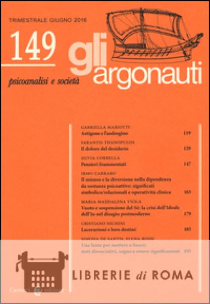 La rivista "Gli Argonauti" propone al lettore uno strumento di dialogo e di confronto sulle tematiche fondamentali del discorso psicoanalitico, permettendogli di partecipare al dibattito culturale in corso sulla relazione tra individuo e società. In uno spirito di libero e solidale confronto, la rivista ha pubblicato in questi anni contributi di psicoanalisti e autori che, nei vari contesti culturali e di lavoro, fanno riferimento alla psicoanalisi come a uno strumento critico, operativo e propulsivo irrinunciabile. "Gli argonauti" dà spazio anche a lavori di importanti psicoanalisti stranieri, permettendo al lettore di ampliare e approfondire la propria formazione culturale e scientifica in una prospettiva internazionale di alto livello. "Gli argonauti" ospita sintesi e soluzioni teoretiche di vasto respiro che emergono dall'esperienza clinica e di vita (in Saggi e Labirinto), riflessioni nate dalle attività di lavoro, dubbi e indicazioni originali che gli operatori dei vari contesti pongono e propongono (in Esperienze) e brevi riflessioni, commenti ad altri lavori (in Spigolature). Il dibattito sulla specificità dei gruppi terapeutici e di sviluppo ha un suo spazio (in Gruppi), così come brevi scritti e rapidi spunti di vari autori (in Dibattito e Aforismi). Lo scambio di idee con altri autori, libri o riviste è ospitato nella nuova rubrica Dialoghi.