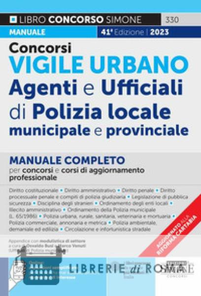 Il manuale "Concorsi Vigile urbano. Agenti e Ufficiali di Polizia locale, municipale e provinciale", giunto nel 2023 alla 41a edizione, contiene tutte le materie generalmente richieste nei bandi di concorso per l'accesso nella Polizia locale in qualità di Agente, Ispettore, Istruttore direttivo di vigilanza ecc. e comunque necessarie per l'aggiornamento professionale. Accanto alle discipline giuridiche di base (diritto costituzionale, diritto amministrativo, diritto penale, procedura penale e ordinamento degli enti locali) sono trattate quelle specialistiche relative ai settori di competenza in cui si articola l'attività della Polizia locale (legislazione di pubblica sicurezza, immigrazione, illecito amministrativo, legge quadro sull'ordinamento della polizia municipale, normativa in materia sanitaria e veterinaria, commercio, ambiente e edilizia, nonché circolazione e infortunistica stradale). Ciascuna materia è aggiornata ai più recenti interventi normativi e giurisprudenziali tra cui si segnalano il D.Lgs. 149/2022, cosiddetta riforma Cartabia e, online, il D.Lgs. 36/2023, Codice dei contratti pubblici. Il manuale si conclude con un'Appendice contenente una serie di esercitazioni e moduli per la redazione dei verbali, di particolare utilità per la prova teorico/pratica. Utilizzando il QR Code (rinvenibile nell'ultima pagina del libro) è possibile accedere alle espansioni semplificate, pensate per agevolare coloro che studiano materie giuridiche per la prima volta; mentre, per coloro che vogliono approfondire e completare la preparazione sono disponibili, sempre online, approfondimenti e normativa d'interesse.