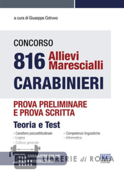 Il volume è un indispensabile strumento per la preparazione alla prova preliminare e alla prova scritta del Concorso per 816 Allievi Marescialli Carabinieri, aperto anche ai cittadini italiani fino a 26 anni. Il bando prevede di selezionare i candidati attraverso le seguenti prove: Prova preliminare: test a risposta multipla con domande di cultura generale, logica deduttiva, informatica e una lingua straniera (inglese, francese, spagnolo e tedesco);  Prova scritta di lingua italiana: 60 quesiti a risposta multipla, volti a verificare la padronanza linguistica, le abilità di ragionamento verbale induttivo e la capacità di comprensione di un testo scritto; Prove di efficienza fisica; Accertamenti attitudinali; Prova orale: interrogazione su storia contemporanea, geografia e Costituzione e cittadinanza italiana. Il testo affronta nella prima parte i quesiti a risposta multipla di carattere psicoattitudinale e di logica. Tutti i quesiti sono accompagnati dalle soluzioni con spiegazioni dettagliate, che chiariscono il procedimento logico per individuare la risposta esatta e forniscono consigli per le tecniche di risoluzione. La seconda parte presenta una sezione manualistica seguita da una selezione di quesiti a risposta multipla di: cultura generale e competenze linguistiche (letteratura italiana, grammatica italiana, storia, storia dell'arte, geografia, educazione civica, matematica, discipline scientifiche); informatica. Nella sezione online collegata al libro sono disponibili: approfondimento sulla Storia e sulla Struttura dell'Arma; quiz di lingua inglese; nuove videolezioni di Giuseppe Cotruvo.