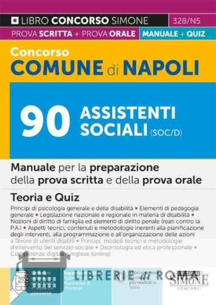 Manuale per la preparazione della prova scritta e della prova orale del Concorso Comune di Napoli 90 Assistenti sociali SOC/D Il manuale Concorso Comune di Napoli - 90 Assistenti sociali (SOC/D) è indirizzato a coloro che devono affrontare la prova scritta e la prova orale previste dal bando di concorso pubblicato nella Gazzetta Ufficiale 9-8-2022, n. 63. La prova scritta consiste in un test, da risolvere in 60 minuti, composto da 40 quesiti a risposta multipla, mentre la prova orale verte, oltre che sull'accertamento della conoscenza delle discipline oggetto della prova scritta, anche sulla verifica della padronanza della lingua inglese. Il libro, in aderenza al bando, tratta le seguenti materie caratterizzanti il profilo, vale a dire: Principi di psicologia generale e della disabilità; Elementi di pedagogia generale; Legislazione nazionale e regionale in materia di disabilità; Nozioni di diritto di famiglia ed elementi di diritto penale (reati contro la P.A.); Aspetti teorici, contenuti e metodologie inerenti alla pianificazione degli interventi, alla programmazione e all'organizzazione delle azioni a favore di utenti disabili; Principi, modelli teorici e metodologie d'intervento del servizio sociale; Deontologia ed etica professionale; Competenze digitali (online); Inglese (per la prova orale; online). Per le altre discipline, già oggetto della prova preselettiva e che si presume, dunque, siano state già studiate (Diritto costituzionale, Diritto amministrativo e Diritto degli enti locali), il testo non include la trattazione teorica (contenuta nel manuale concorso cod. 328/N) ma, grazie ai quiz a risposta multipla contenuti nel software, e possibile ripassare i concetti fondamentali di ciascuna disciplina e verificare il livello di preparazione acquisito. Il manuale e corredato, inoltre, da numerose risorse online: espansioni di approfondimento e normativa d'interesse; un software con quiz a risposta multipla su tutte le materie oggetto della prova scritta, per esercitarsi con infinite simulazioni.