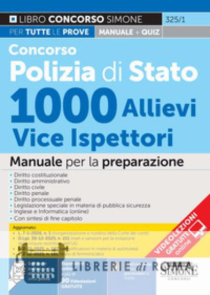 Il manuale Concorso Polizia di Stato 1000 Allievi Vice Ispettori tratta tutte le materie oggetto delle prove d'esame (scritta e orale). Il testo, che analizza tutti gli argomenti con linguaggio semplice e immediato, segue il programma del bando ed è cosi strutturato: - Parte I: Diritto costituzionale; - Parte II: Diritto amministrativo; - Parte III: Diritto civile; - Parte IV: Diritto penale; - Parte V: Diritto processuale penale; - Parte VI: Legislazione speciale in materia di pubblica sicurezza; - Inglese e Informatica (online). Le sintesi di fine capitolo, presenti in ciascuna delle materie trattate, offrono un quadro riepilogativo dei temi affrontati e rappresentano un prezioso supporto per verificare la comprensione degli aspetti essenziali delle discipline da studiare. Il manuale tiene conto delle più recenti novità legislative, tra cui si segnalano: L. 7-1-2026, n. 1 (riorganizzazione e riordino delle funzioni della Corte dei conti); D.Lgs. 30-12-2025, n. 211 (reati e sanzioni per violazione delle misure restrittive dell'UE); L. 2-12-2025, n. 182 (semplificazioni in materia di autotutela; modifica dei termini di assenza e morte presunta); L. 2-12-2025, n. 181 (introduzione del delitto di femminicidio). Il testo, per la completezza della trattazione, rappresenta dunque un valido strumento per affrontare: - la prova scritta, che consiste in quiz a risposta multipla su diritto penale, diritto processuale penale e diritto costituzionale; - la prova orale, incentrata, oltre che sulle materie oggetto della prova scritta, anche su nozioni di diritto amministrativo e legislazione speciale in materia di pubblica sicurezza, nozioni di diritto civile, inglese e informatica. Il libro si completa con numerose risorse online: - un software con migliaia di quiz sulle materie oggetto della prova scritta, per esercitarsi efficacemente con infinite simulazioni in vista dell'esame. Grazie alla funzionalità gaming, sfidando gli altri candidati al concorso, e possibile valutare il livello di preparazione raggiunto; - oltre 90 videolezioni gratuite; - espansioni normative e di approfondimento. Sempre online verranno caricate ulteriori espansioni che terranno conto di eventuali aggiornamenti normativi in corso di approvazione, come il pacchetto sicurezza 2026.