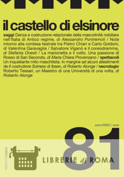 La rivista: «Il castello di Elsinore» è una rivista semestrale di teatro profondamente radicata nell'Università italiana. Nata nel 1988, la rivista raccoglie nel suo comitato scientifico quasi la metà degli ordinari di Storia del teatro in Italia e illustri studiosi di università straniere. La rivista è articolata in tre sezioni (talvolta quattro): la prima, intitolata Saggi, comprende rigorosi studi critici su personaggi e opere della storia del teatro e dello spettacolo; la seconda, Materiali, raccoglie e cura documenti, lettere e riflessioni di poetica; la terza, Spettacoli (e/o Libri), recensisce e analizza gli avvenimenti più significativi della stagione teatrale italiana e straniera. I temi di cui la rivista si occupa sono svariati e attraversano l'intera storia del teatro europeo, dal teatro greco alla Commedia dell'Arte, dal teatro rinascimentale italiano al teatro nordico di Ibsen e Strindberg, dal simbolismo europeo a Pirandello. INDICE DEL NUMERO 81/2020: SAGGI «...del pigliar la Dama per condurla al ballo con leggiadria». Danza e costruzione relazionale della mascolinità nobiliare nell'Italia di Antico regime, di Alessandro Pontremoli / Note intorno alla contesa teatrale tra Pietro Chiari e Carlo Goldoni, con il contributo di alcune epistole di Placido Bordoni al canonico Lodovico Ricci, di Valentina Garavaglia / «Un ballo senza ballo». Salvatore Viganò e il coreodramma, di Stefania Onesti / La marionetta e il volto. Una passione di Rosso di San Secondo, di Maria Chiara Provenzano / SPETTACOLI Un inquietante mito maschilista. Note in margine ad alcuni allestimenti de "Il costruttore Solness" di Ibsen, di Roberto Alonge / NECROLOGIO Roberto Tessari, un Maestro di una Università di una volta, di Roberto Alonge.